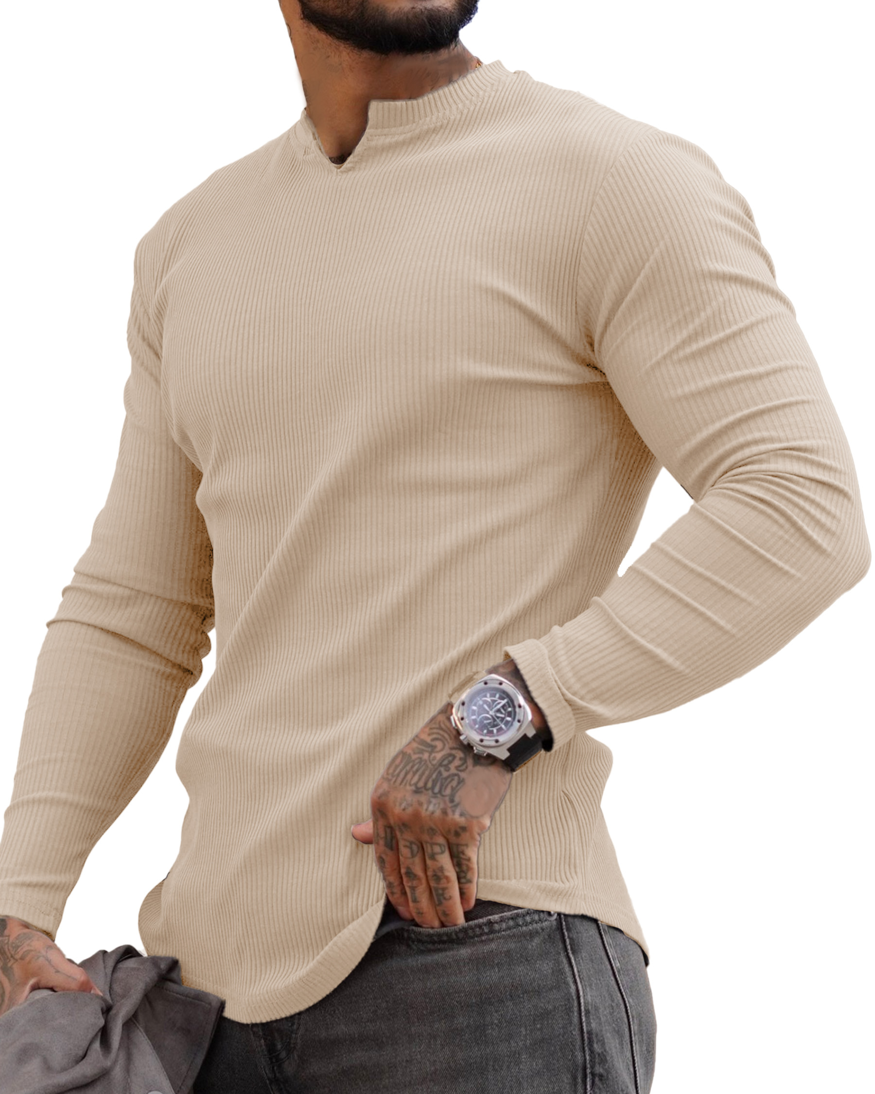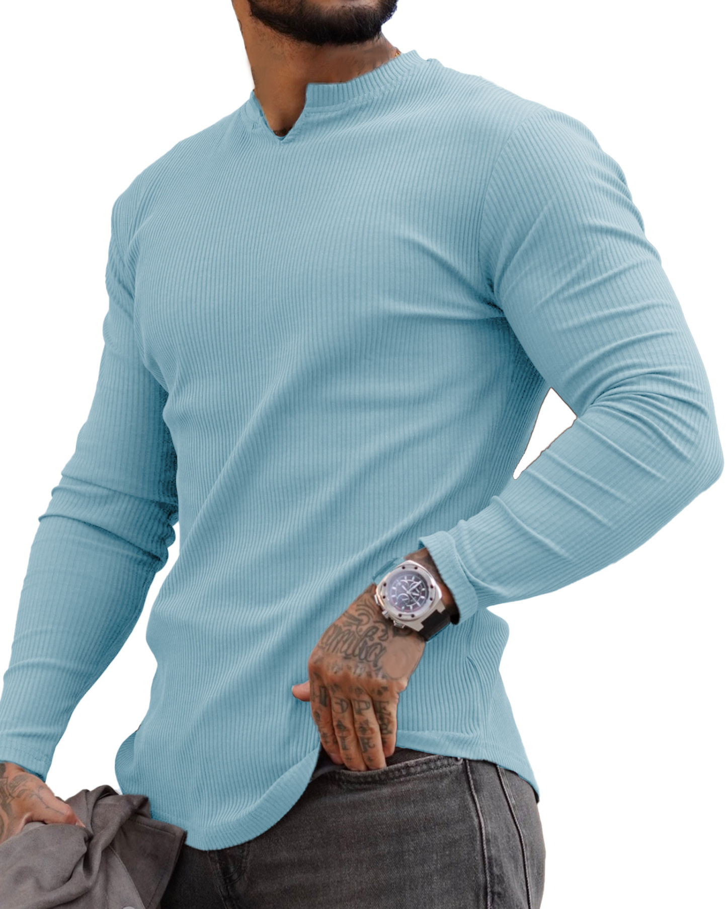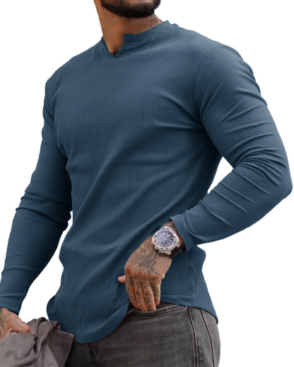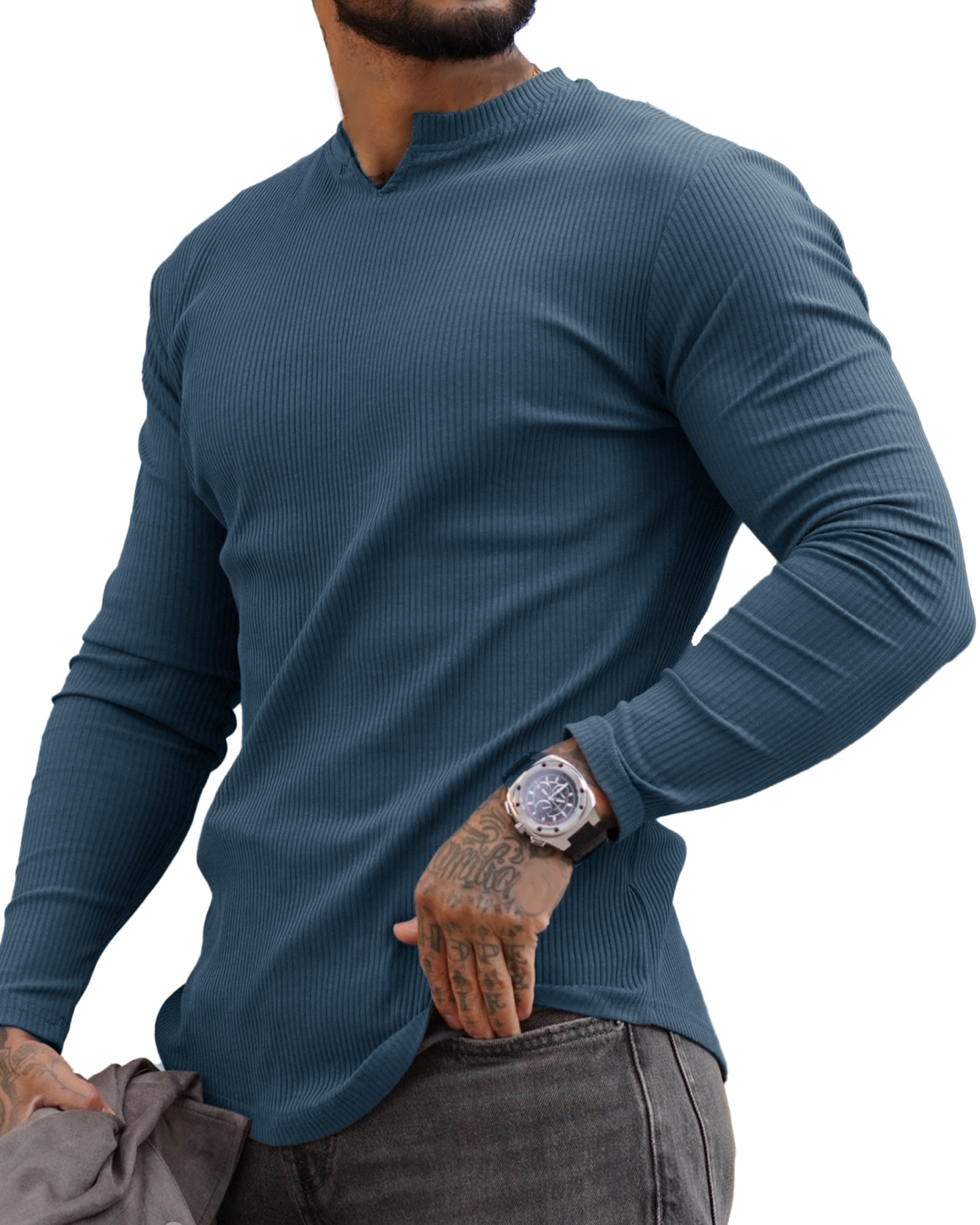 Men's Fashion Casual V-neck Ribbed Fabric Long Sleeve T-shirt