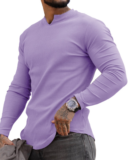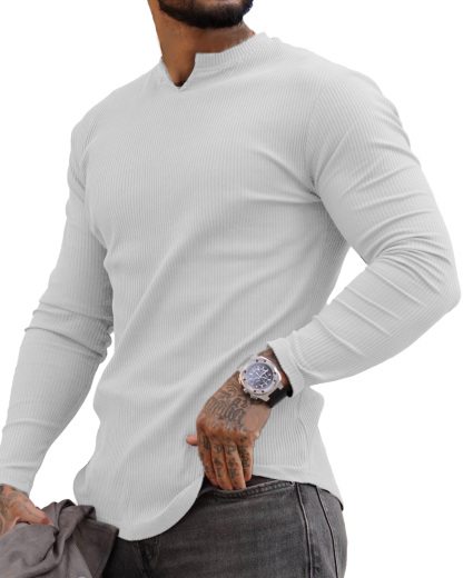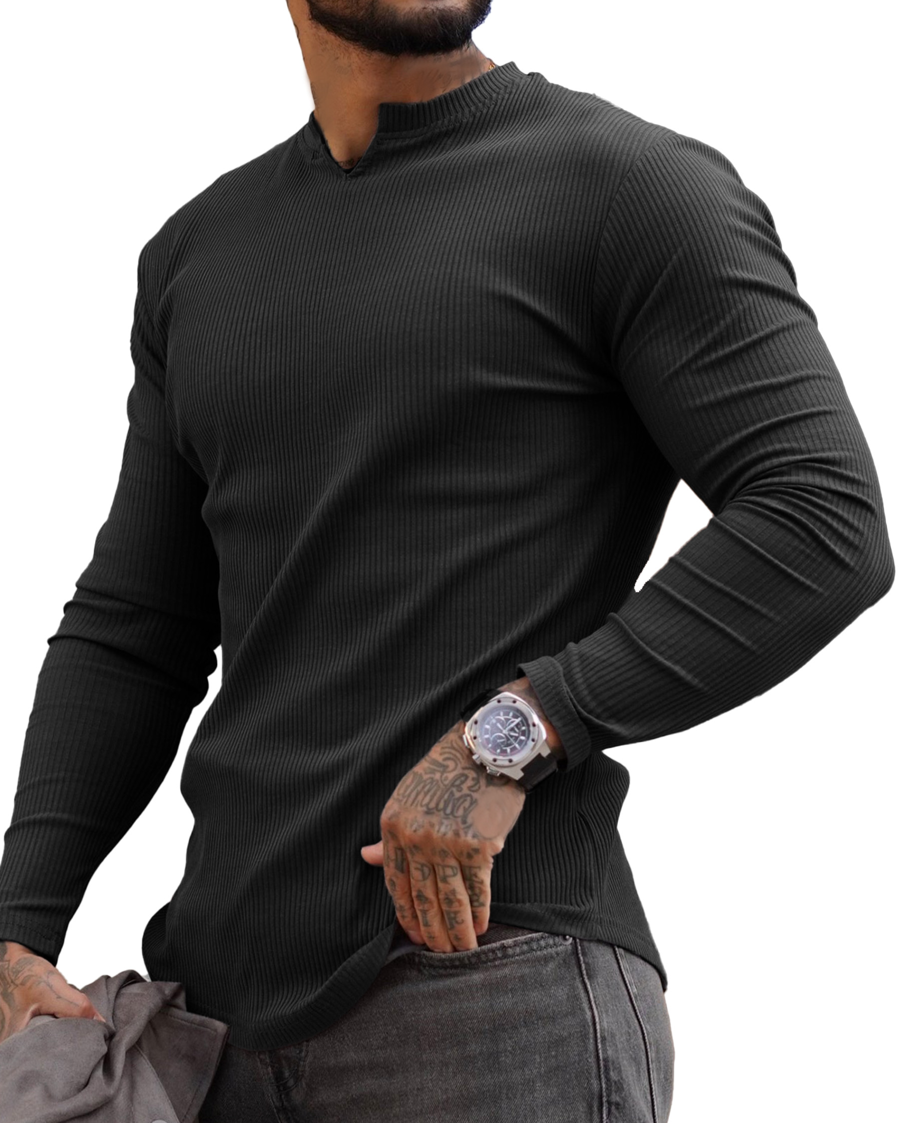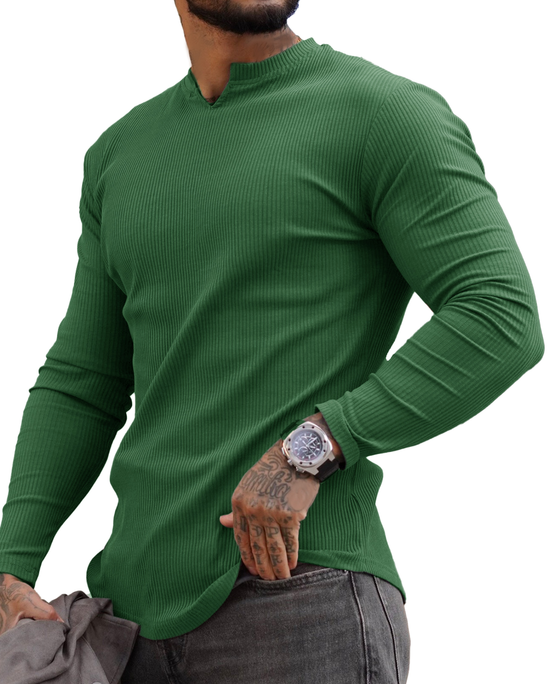 Men's Fashion Casual V-neck Ribbed Fabric Long Sleeve T-shirt