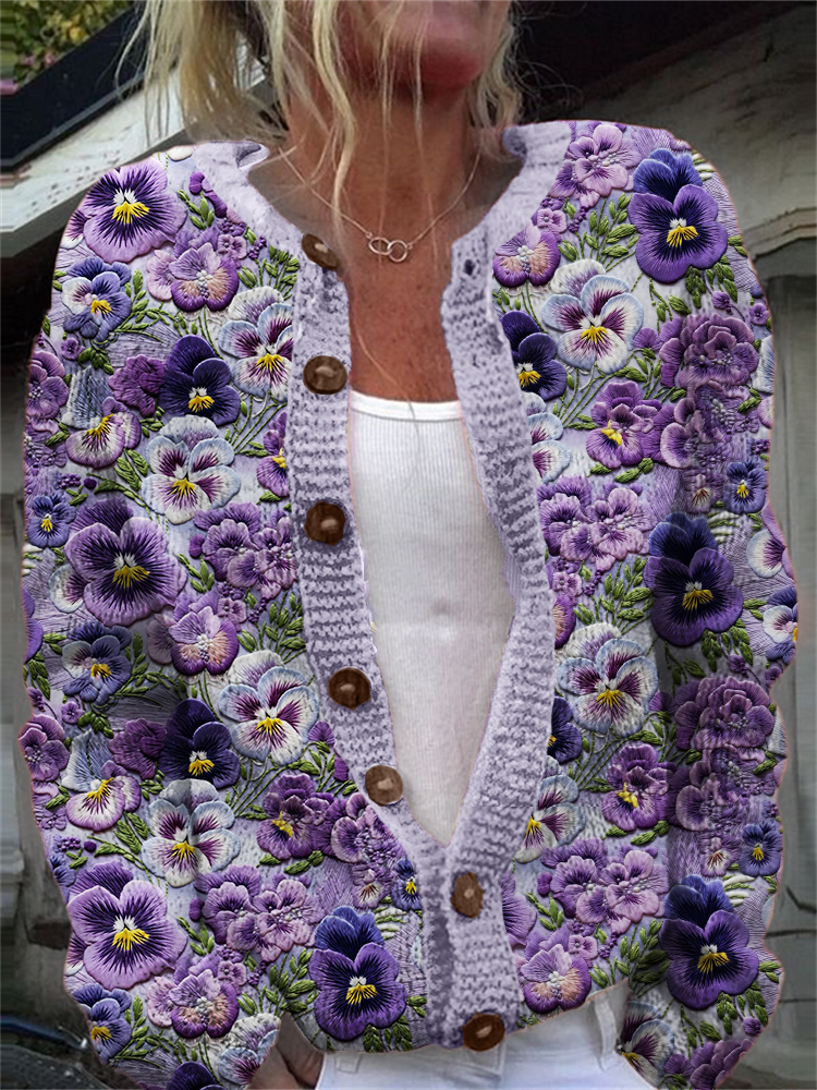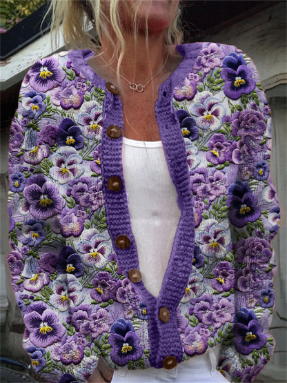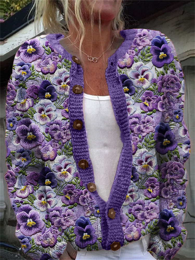 Pansy Flowers Embroidery Pattern Cozy Knit Cardigan