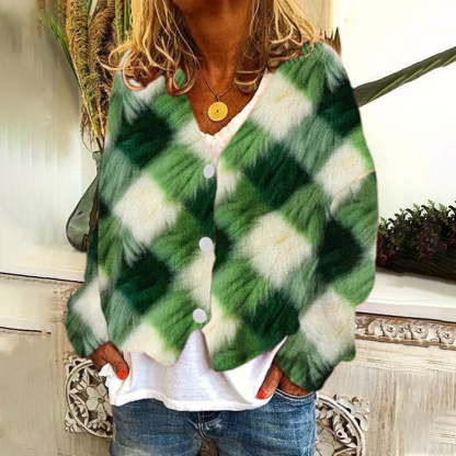 St. Patrick's Day Plaid Square Art Print V-Neck Knitted Cardigan