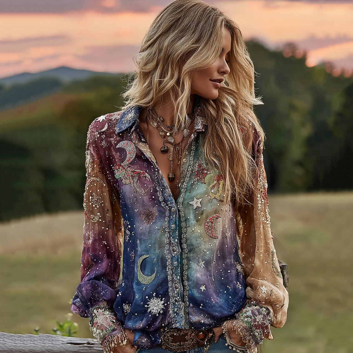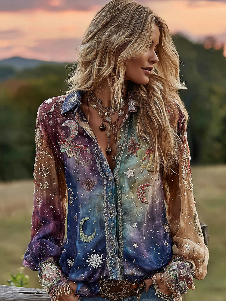 Tie-dye Star Moon Embroidered Sequined Ombre Witch Shirt