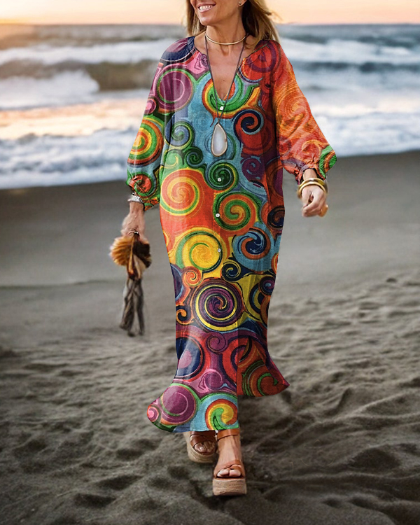 Vintage Abstract Art Long Sleeve Cardigan Maxi Dress