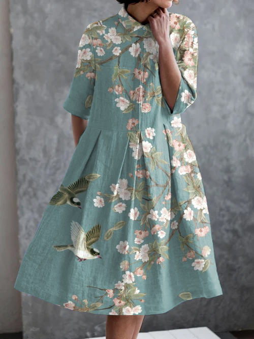 Vintage Bird Floral Print Casual Pocket Half Sleeve Dress