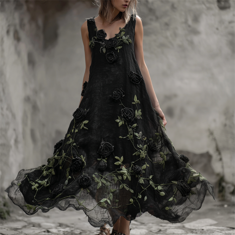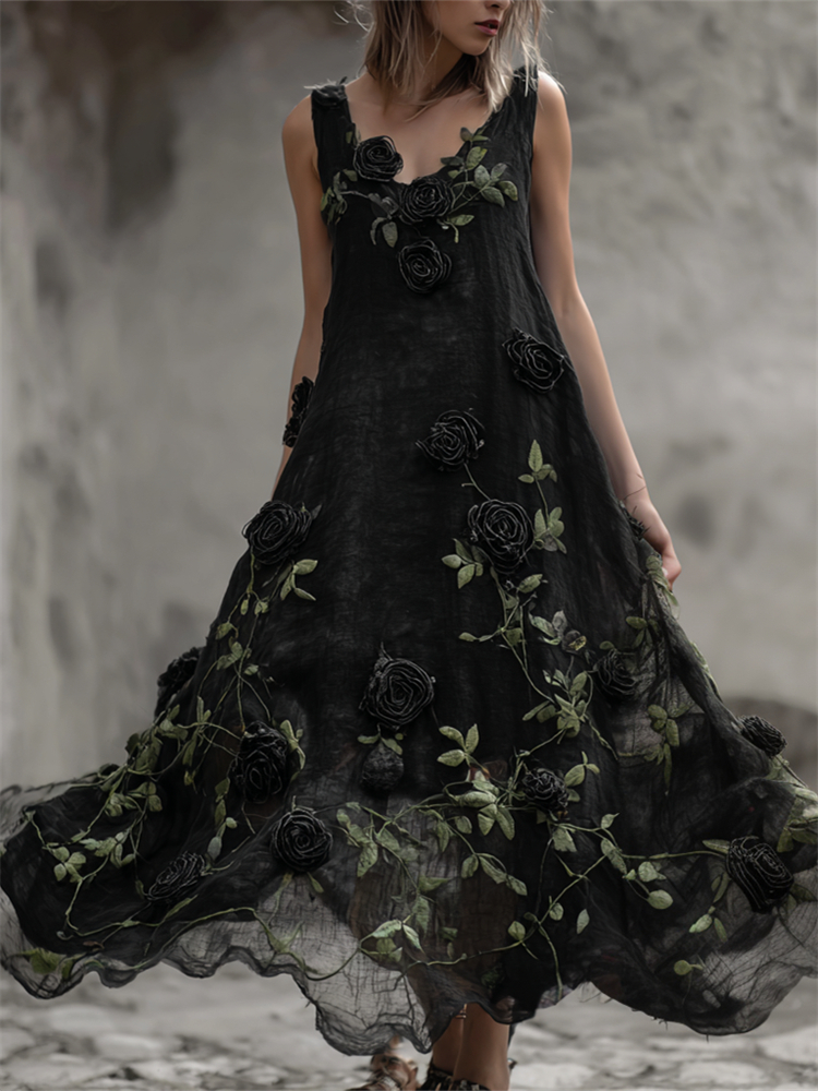 Vintage Gothic Black Roses Vines Fiber Art Flowy Linen Dress