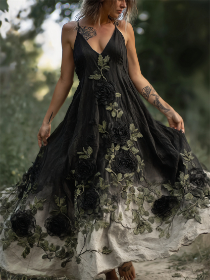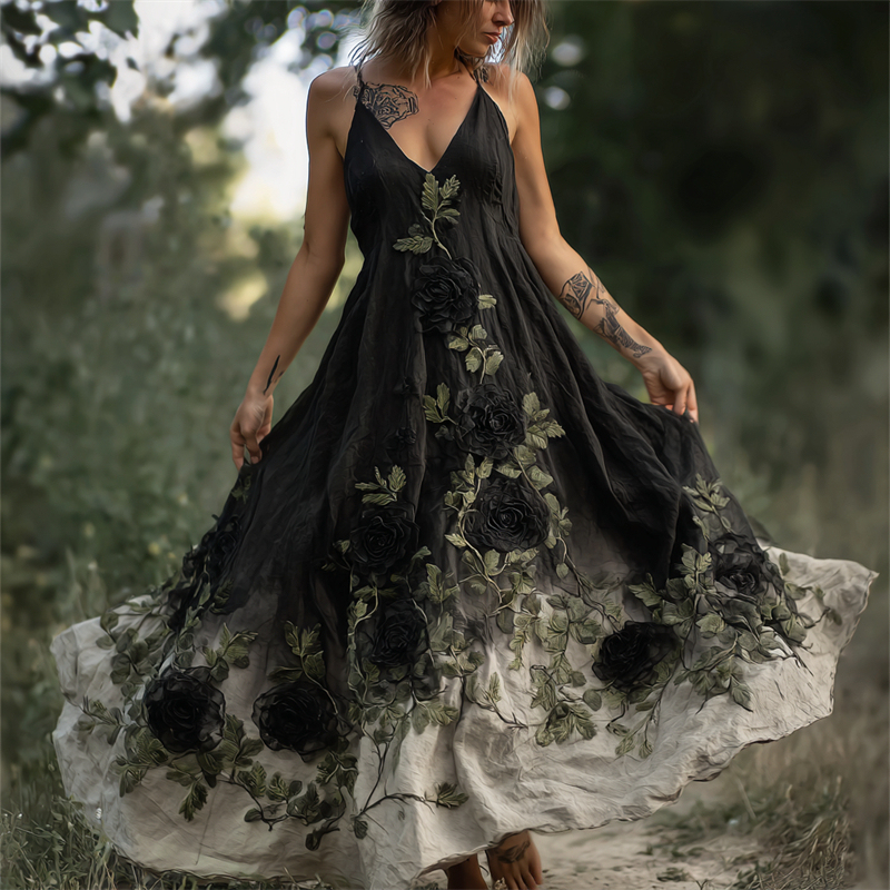 Vintage Gothic Black Roses Vines Gradient Flowy Linen Dress