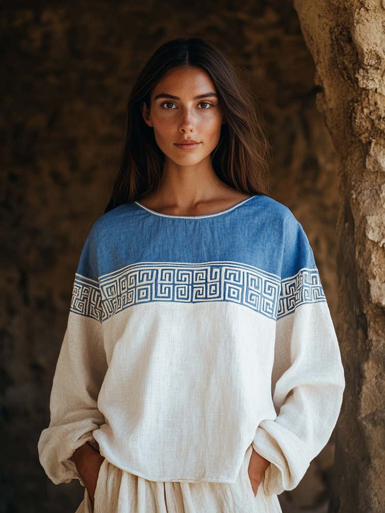 Vintage Greek Key Art Embroidered Linen Blend T-shirt