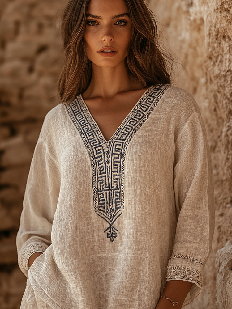 Vintage Greek Key Embroidery Linen Cozy T-shirt