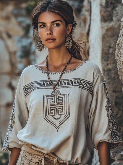 Vintage Greek Key Motif Crew Neck Long Sleeves Linen Blend Blouse