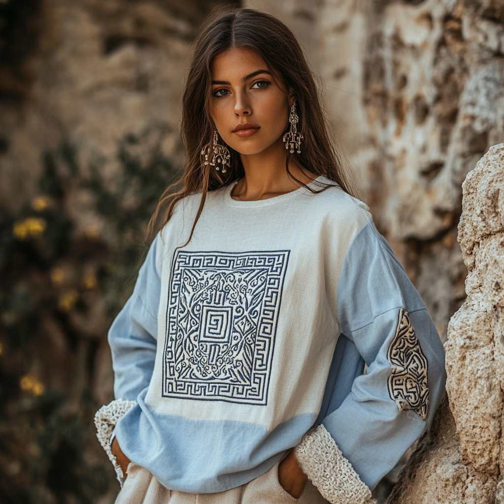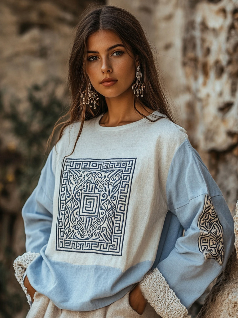 Vintage Greek Key Motif Patchwork Lace Cotton Linen Contrast Shirt