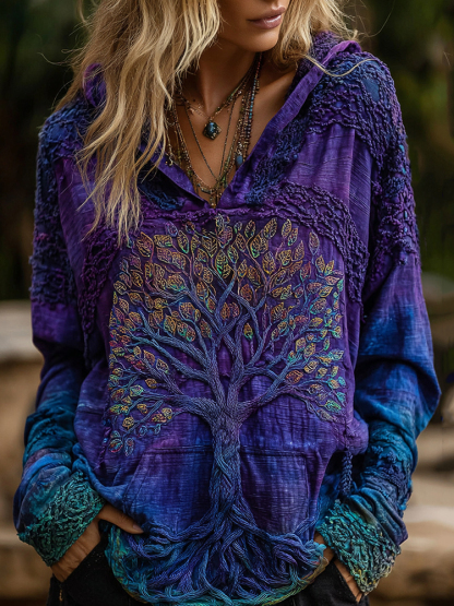 Women's Classic Viking Tree Of Life With Celtic Knot Art Gradient Comfort Hooded Linen Shirt