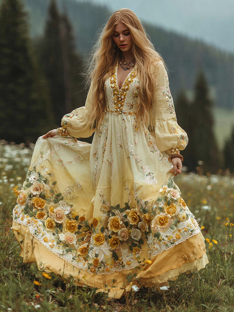 Women's Classic Yellow Floral Art Print V-neck Long Sleeve Maxi Dress