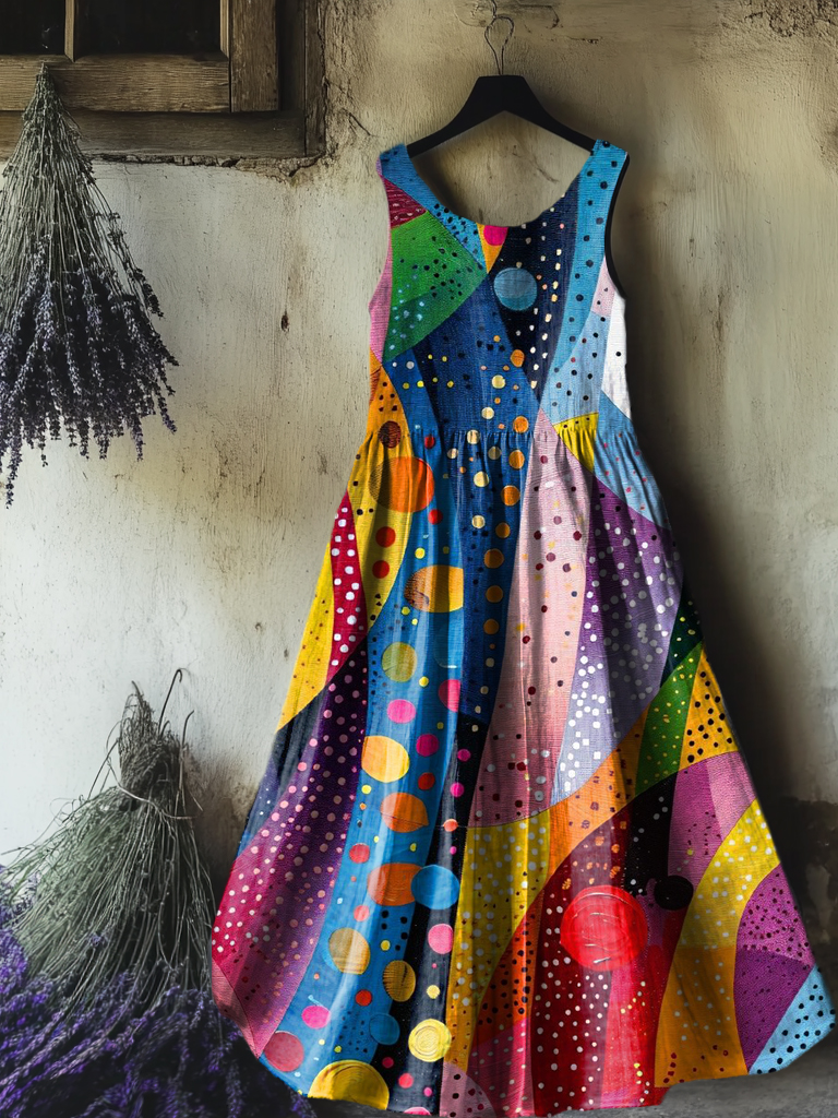 Women's Colorful Patterns Art Print Round Neck Sleeveless Cotton Pocket Dresses