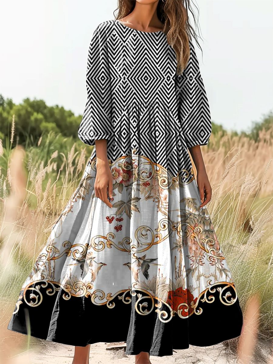 Women's Diamond Floral Embellished Pattern Art Print Cotton Crew Neck Dress
