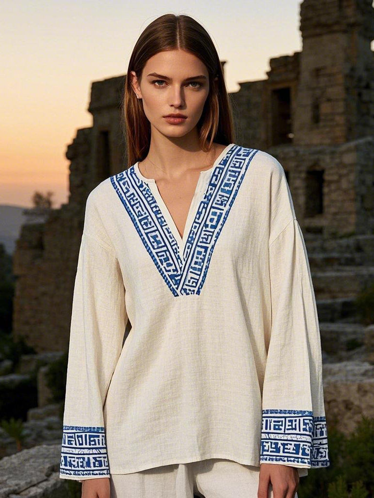 Women's Greek Geometric Art V-neck Linen Blend Blouse