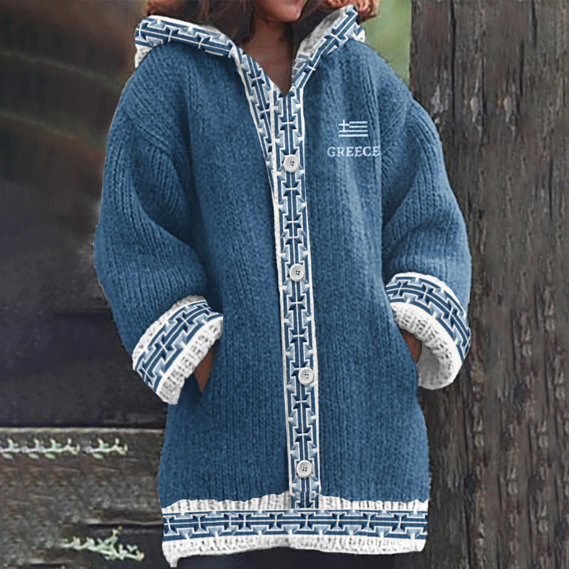Women's Greek Trigram Flag Inspired Jacquard Knit Cozy Hooded Cardigan