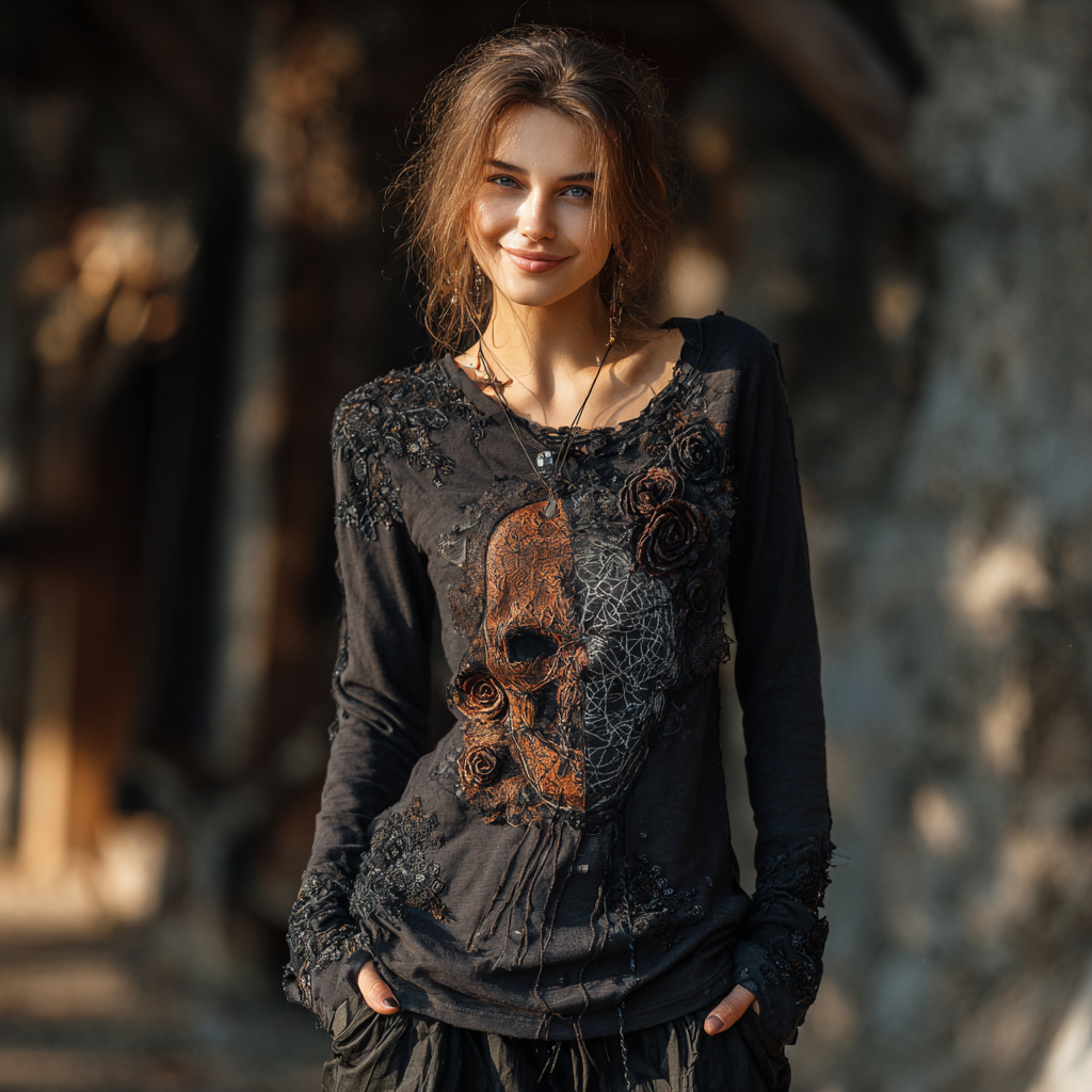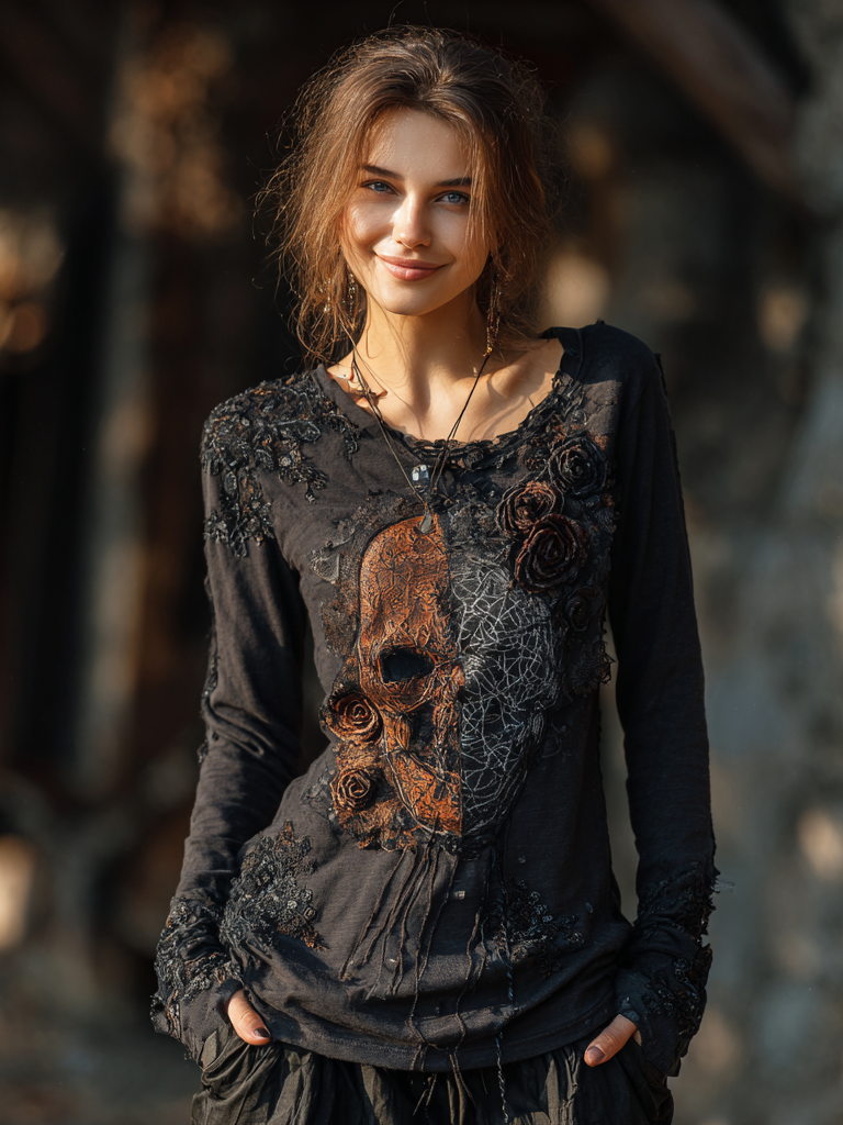 Women's Rose Skull And Spider Web Embroidered Halloween T-shirt