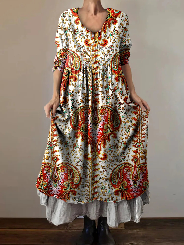 Women's Vintage Ethnic Floral Art Print V-Neck Button Pocket Cotton Dress
