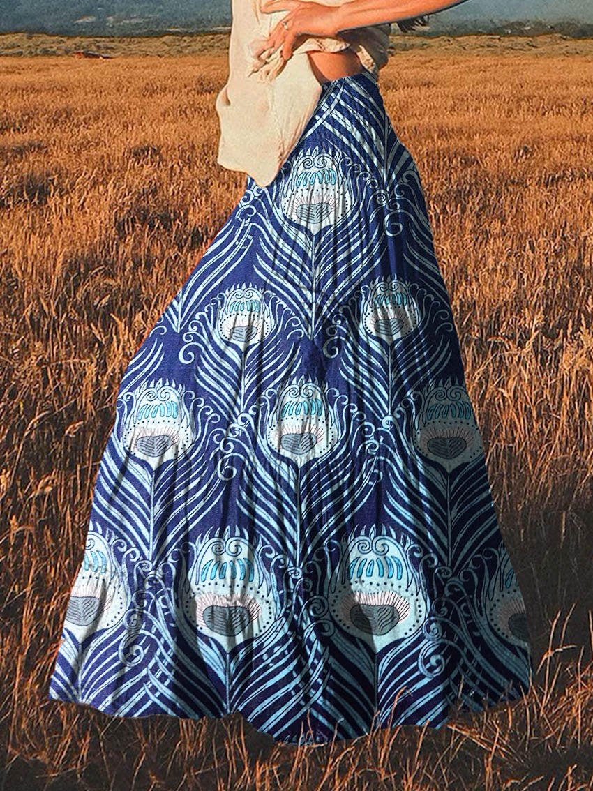 Women's Vintage Feather Art Pattern Print Cotton Pocket Skirt
