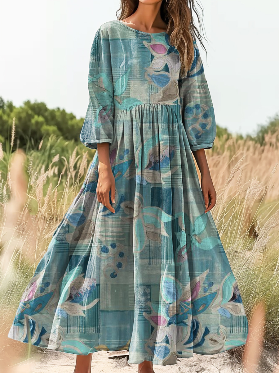 Women's Vintage Floral Art Print Flowy Cotton Crew Neck Dress