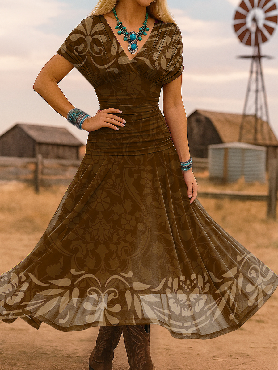 Women's Vintage Floral Print Stretch-mesh Maxi Dress