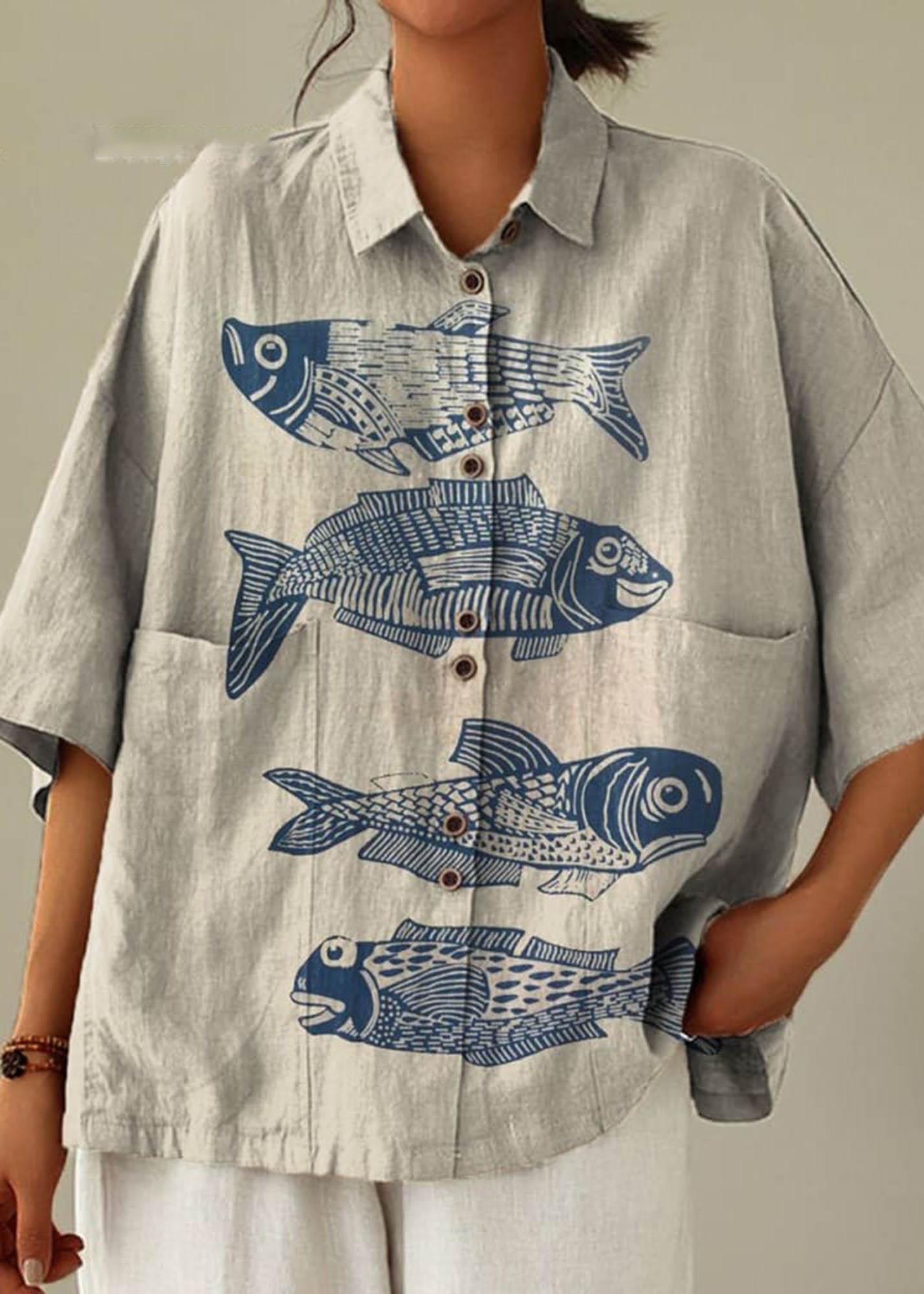 Women's Vintage Lovely Fish Art Print Casual Cotton Linen Shirt