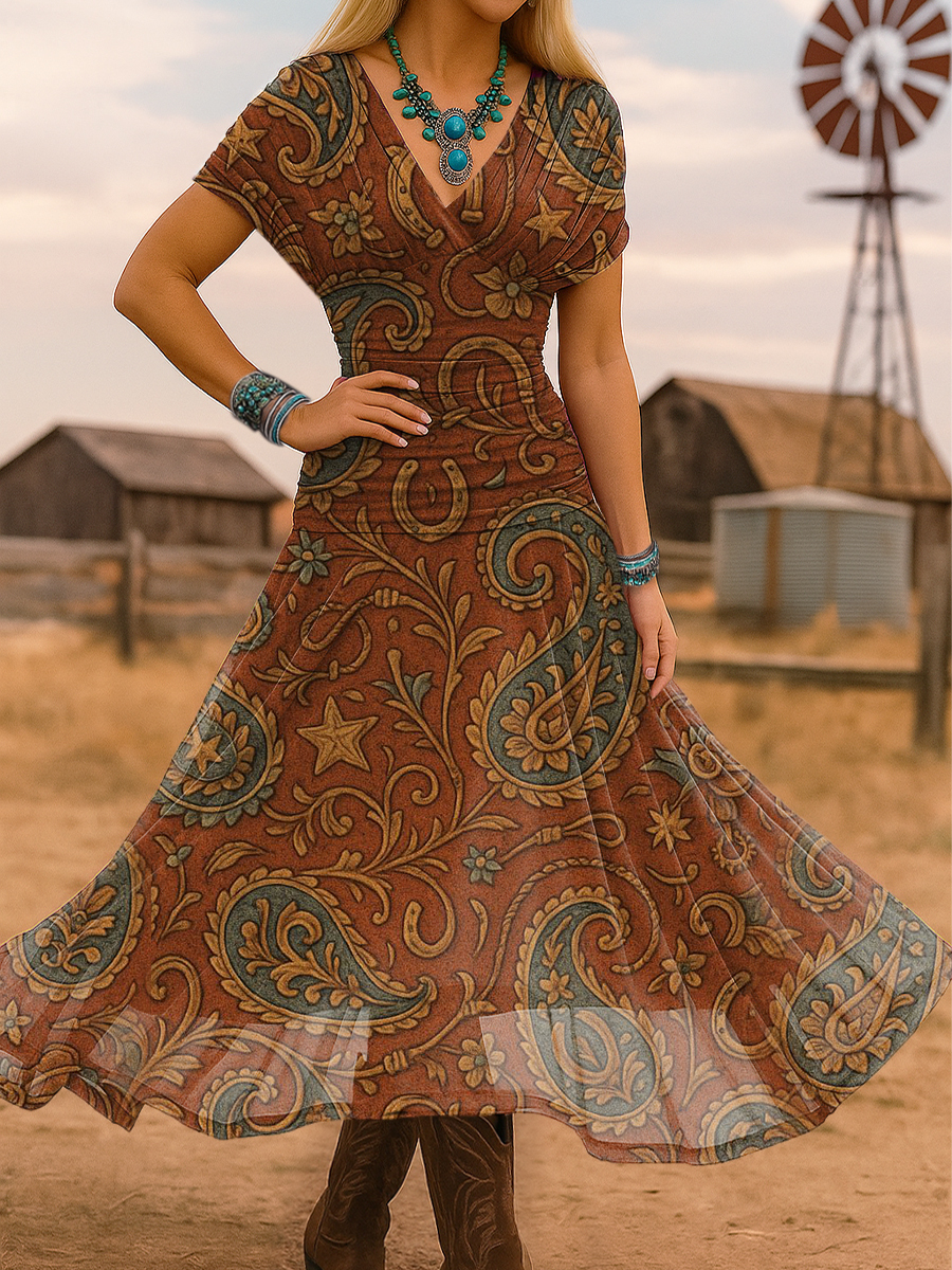 Women's Vintage Paisley Print Stretch-mesh Maxi Dress