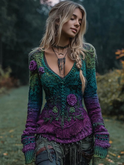Women's Vintage Rose Gradient Art Knit V Neck Sweater