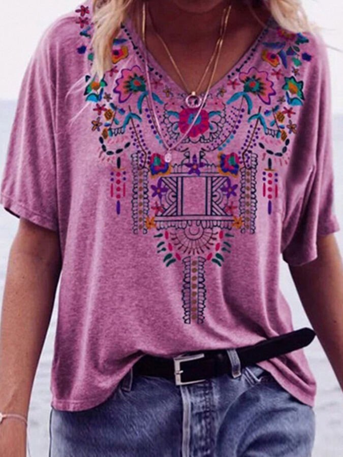 Ladies Spring/Summer V-Neck Ethnic Print Short Sleeve T-Shirt