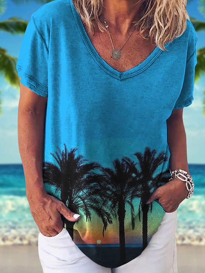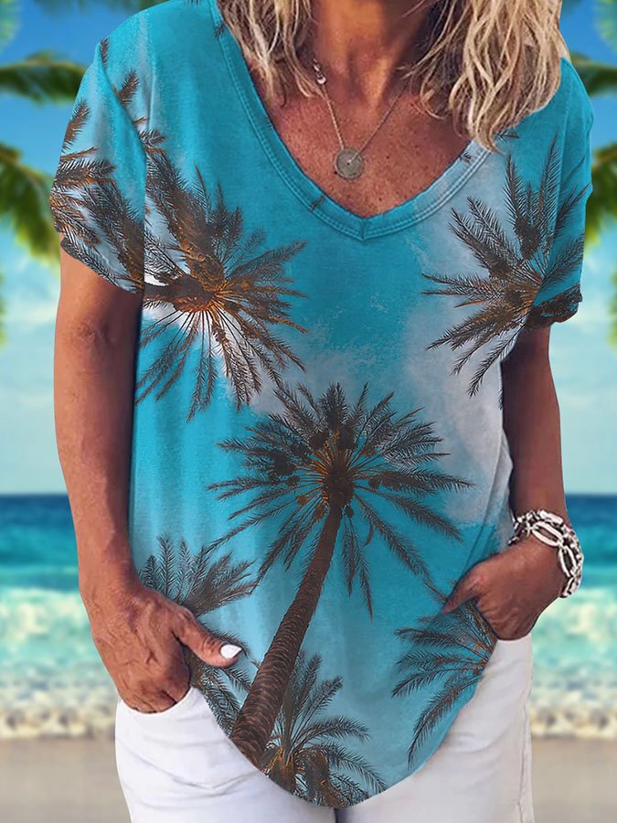 V-Neck Palm Tree Print Short Sleeve T-Shirt