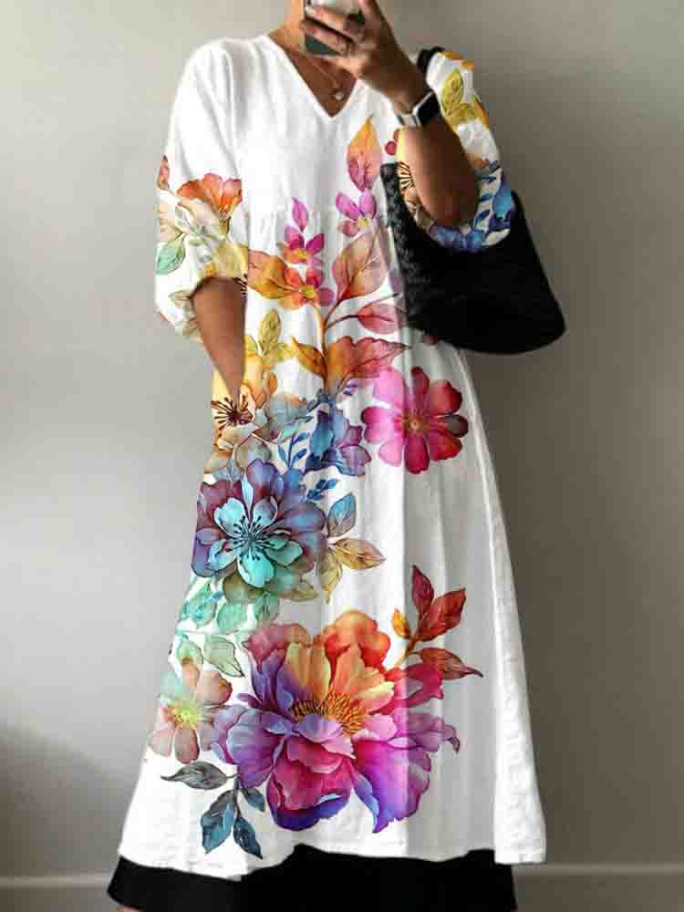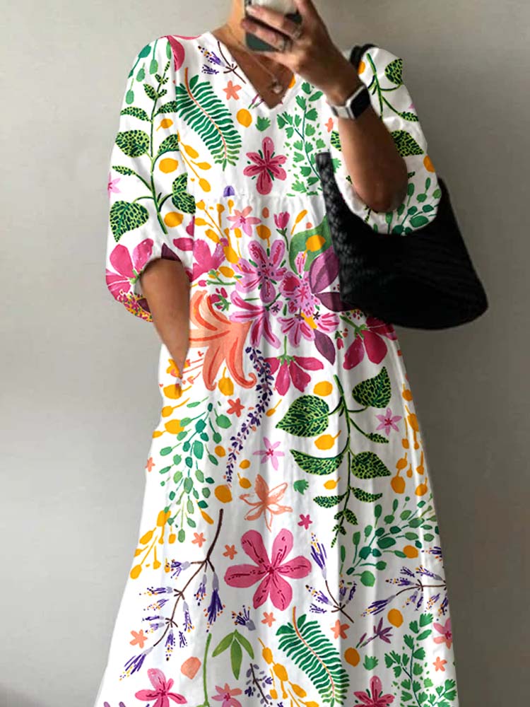 Women's Vintage Lovely Floral Art Print Pocket V-neck Cotton Dress