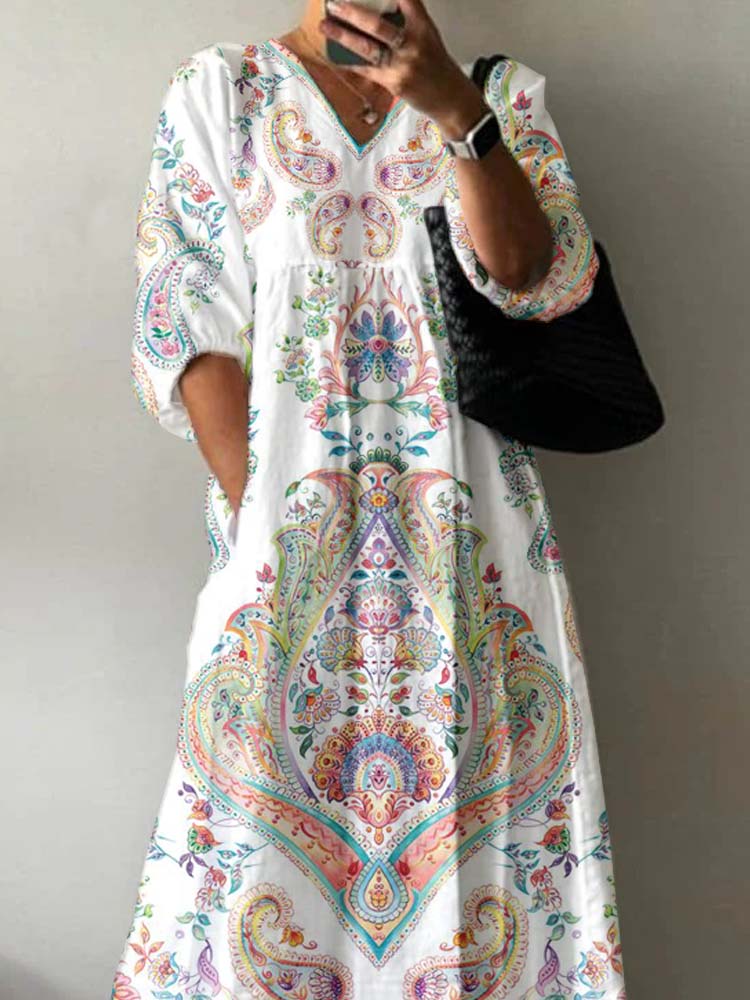 Women's Boho Vintage Floral Print Pocket V-neck Cotton Dress