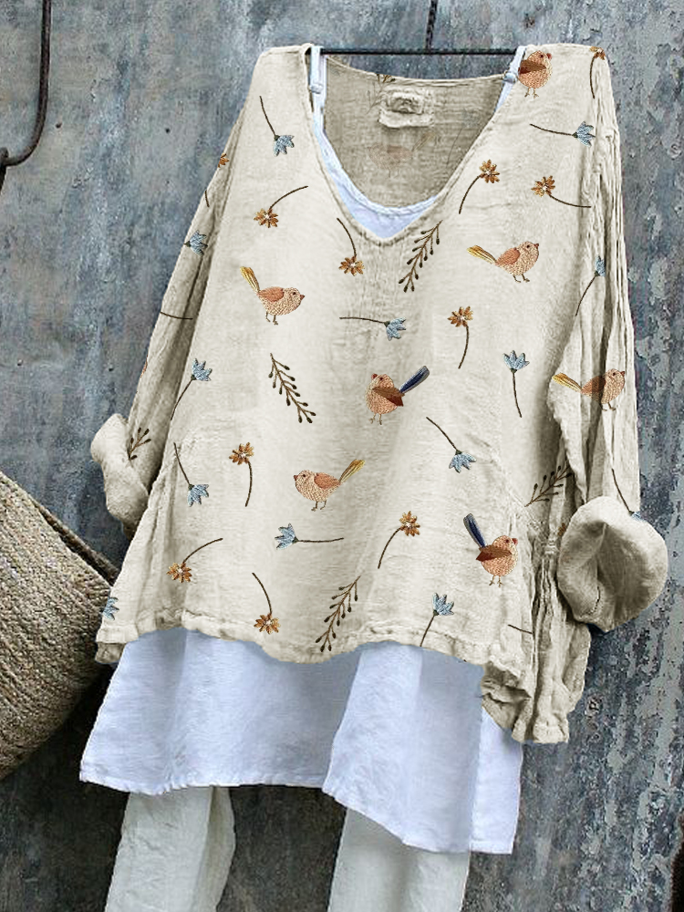 Birds Floral Embroidery Pattern Flowy Tunic