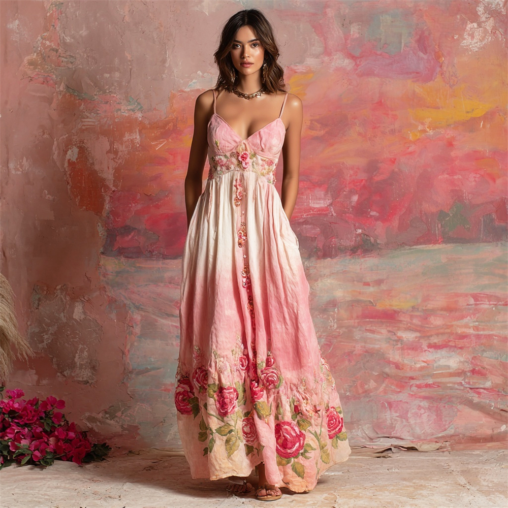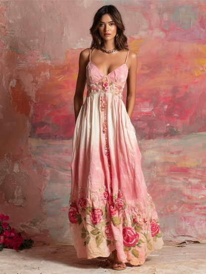 Boho Romantic Floral Embroidery Women's Spaghetti Strap Maxi Dress