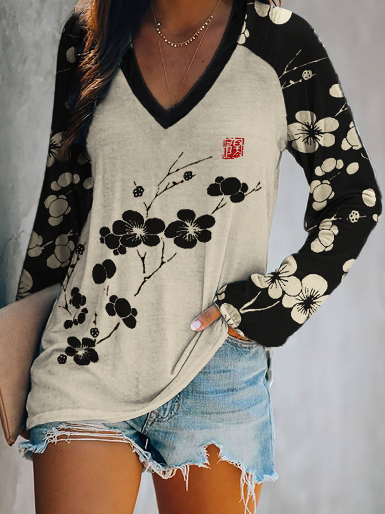 Cherry Blossom Japanese Lino Art Raglan T Shirt