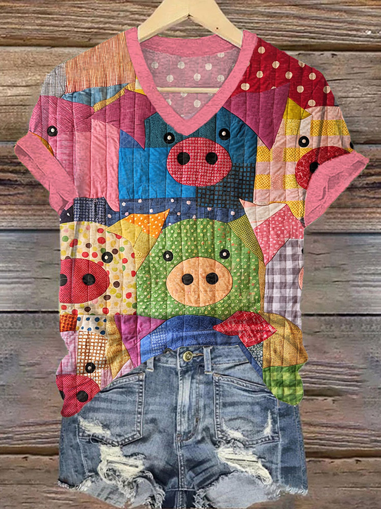 Cute Pig Pattern Patchwork Design V-Neck T-Shirt