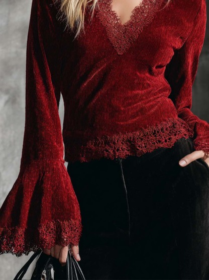 Elegant Retro And Exquisite V-neck Lace-trimmed Red Chenille Top