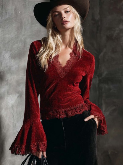 This elegant and retro top is crafted from exquisite red chenille fabric. The V-neck design is accented with intricate lace trimming, offering a romantic and sophisticated allure. The rich, plush texture of chenille adds a touch of luxury, making it an ideal choice for both daywear and evening occasions.