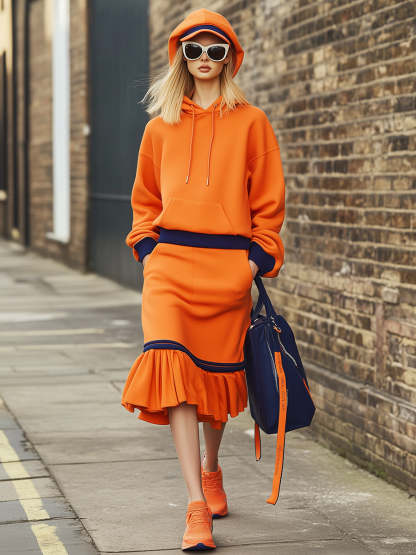 This stylish and vibrant ruffled navy blue and orange midi dress is an eye-catching piece with its bold colors and modern design. It combines style and comfort, making it ideal for daytime activities and evening parties. Wear it with confidence and let this dress be the highlight of your wardrobe.