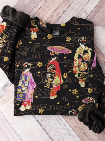 Japanese Geisha Cherry Blossom Wave Pattern Comfy Sweatshirt