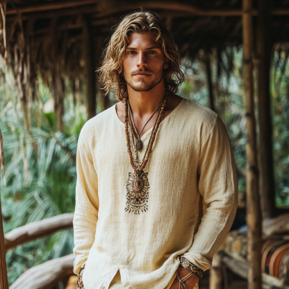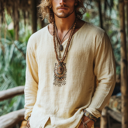 Men's Bohemian Holiday Style Vintage Linen Printed Casual Long Sleeve Top