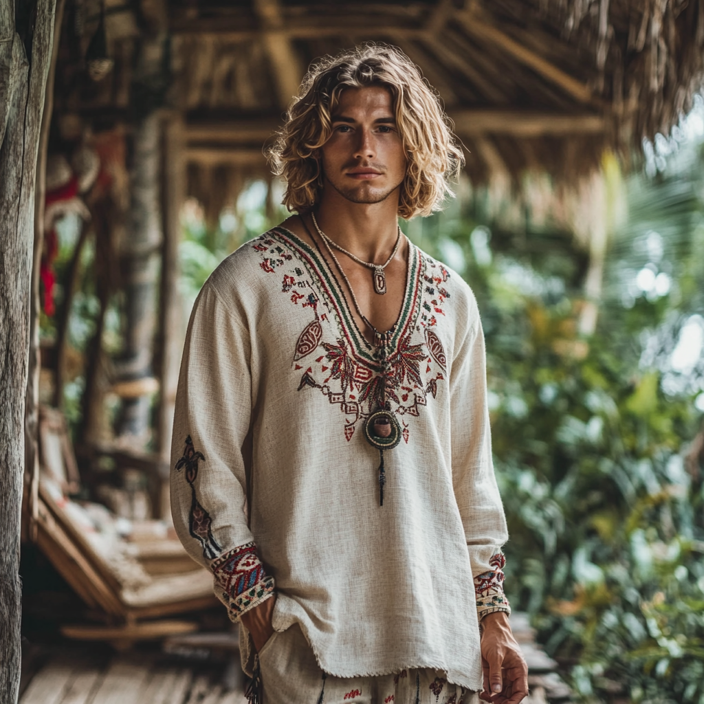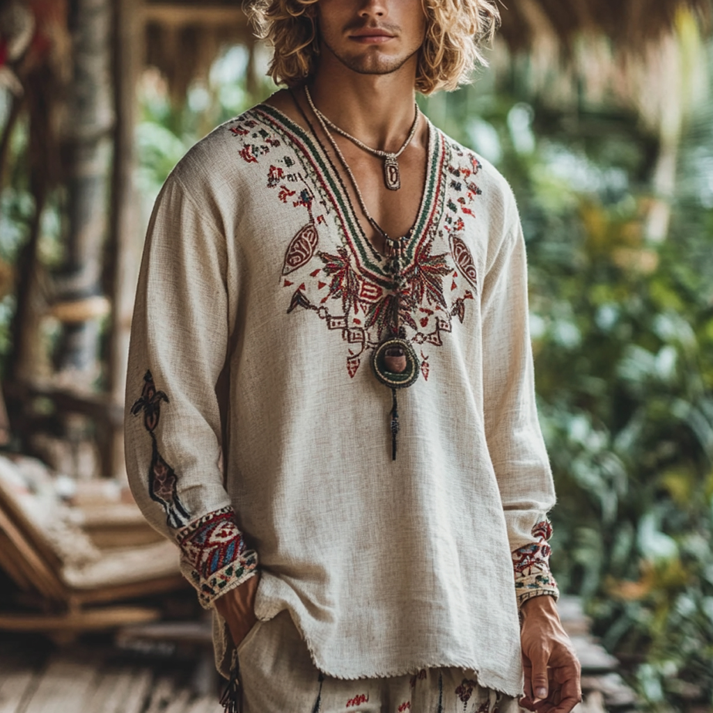 Men's Bohemian Holiday Style Vintage Linen Printed Casual Long Sleeve Top