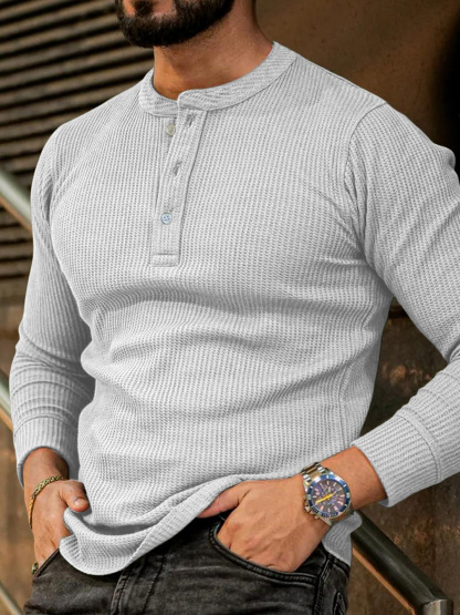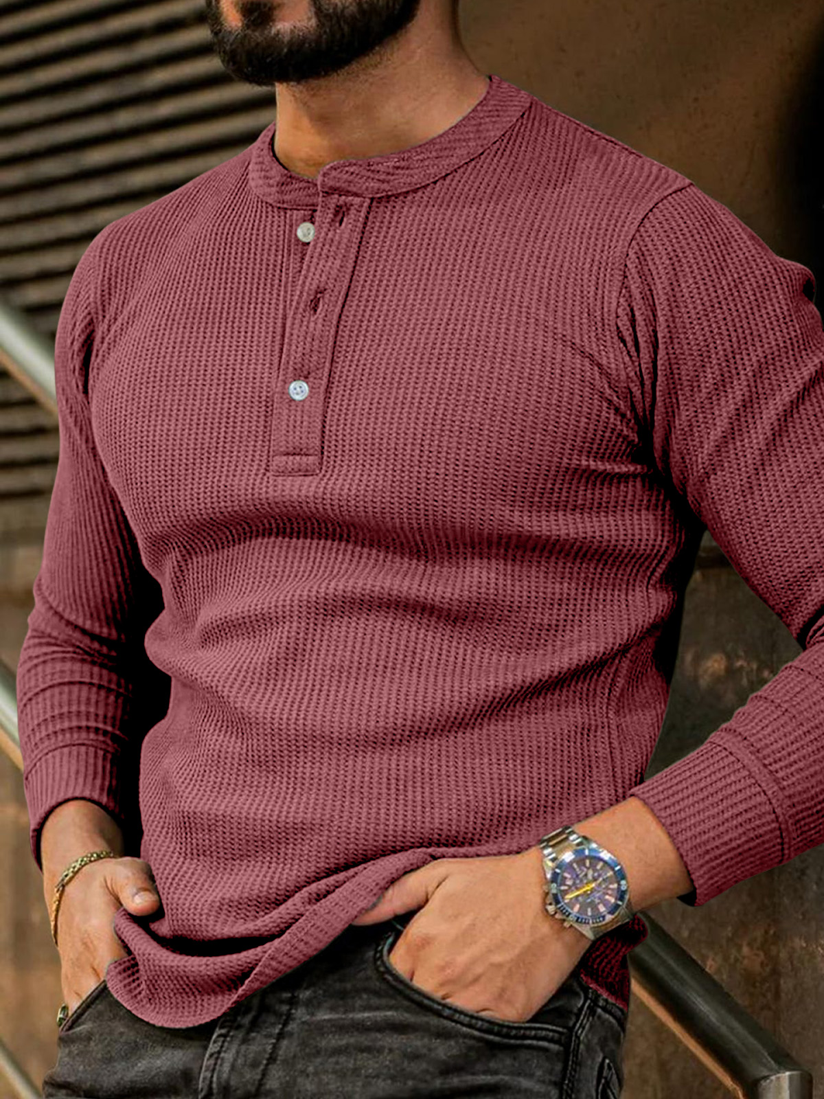 Men's Casual Retro Solid Color Waffle Long Sleeve Button-down Henley