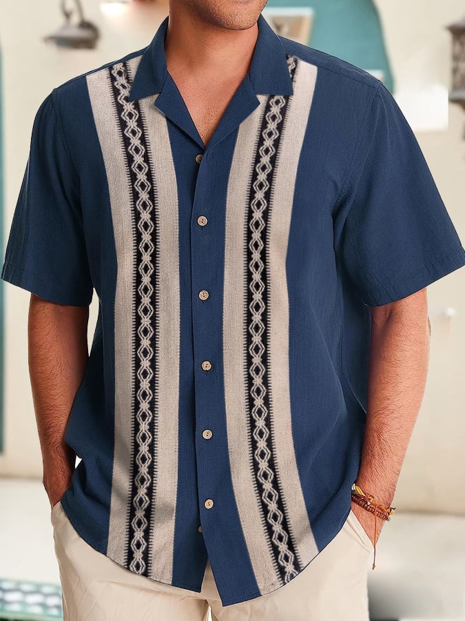 Men's Casual Simple Guayabera Printed Linen Cuban Collar Shirt