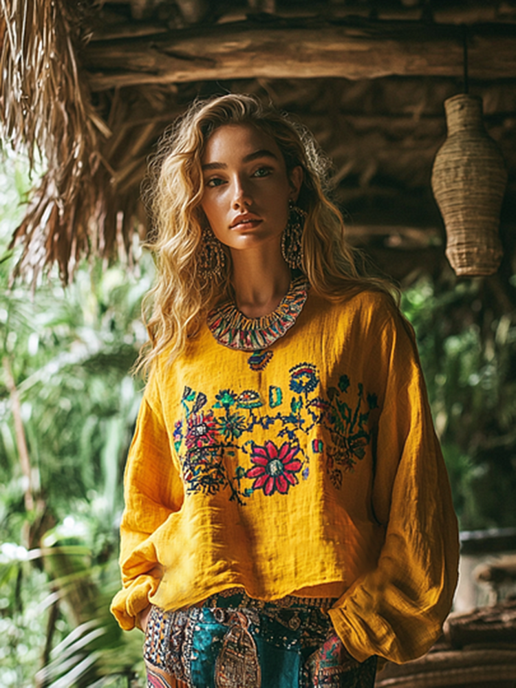 Retro Bohemian Floral Art Embroidery Print Cotton And Linen Blend Loose Blouse