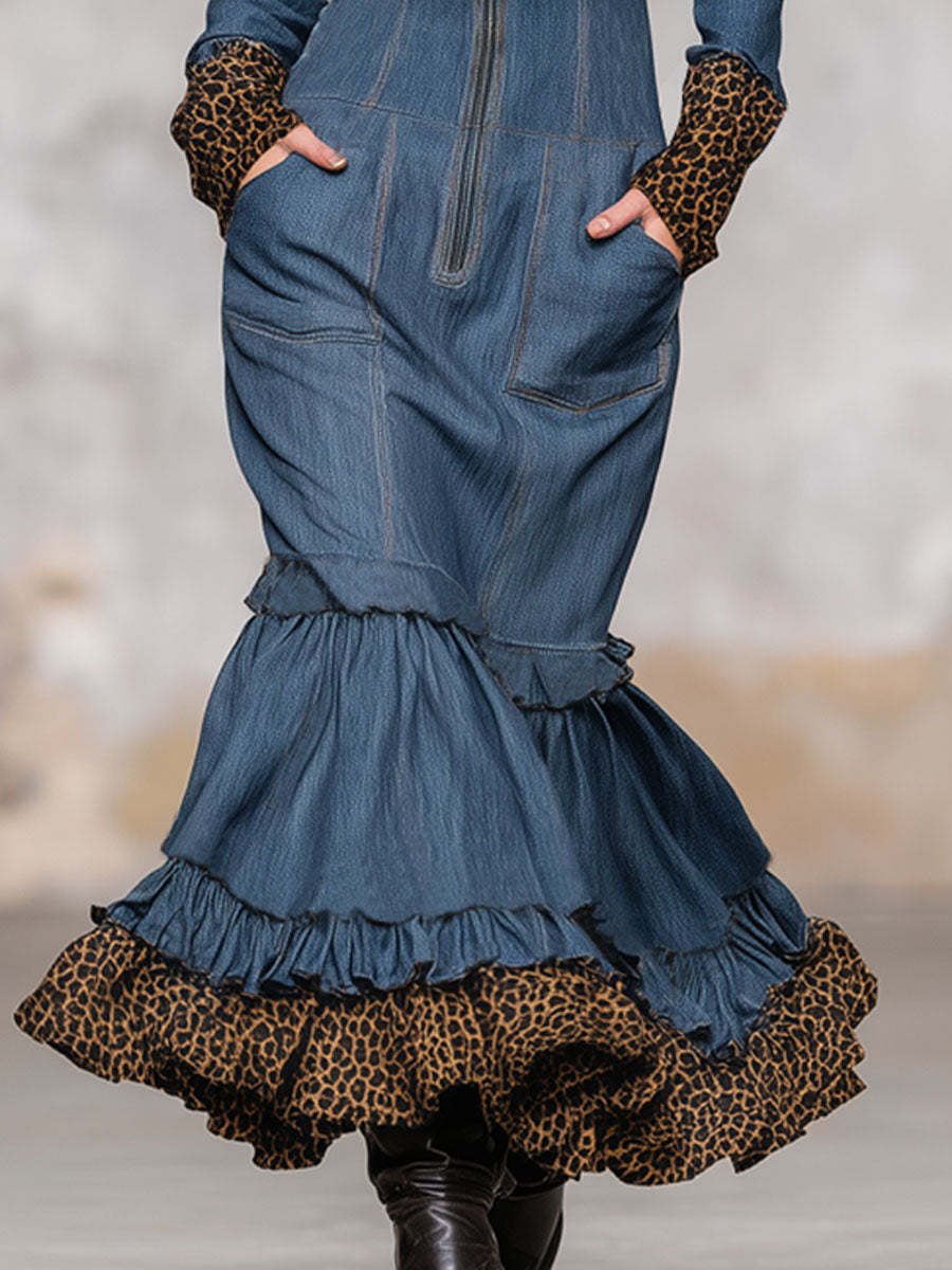 Retro-style Denim Patchwork Leopard Print Zipper Maxi Dress