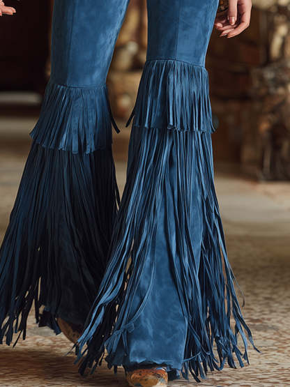 These stylish retro blue double-layered fringed faux suede pants will elevate your wardrobe. Made from premium faux suede, the unique double-layer design adds texture and dimension to your look. The vintage blue hue lends a timeless beauty, while the fringed details on each layer add a touch of playful dynamism.