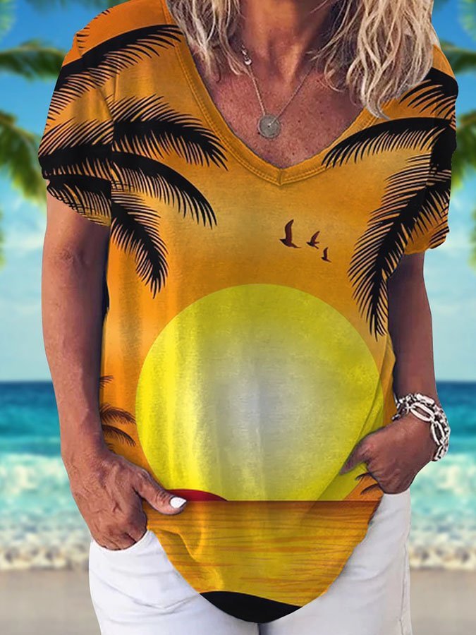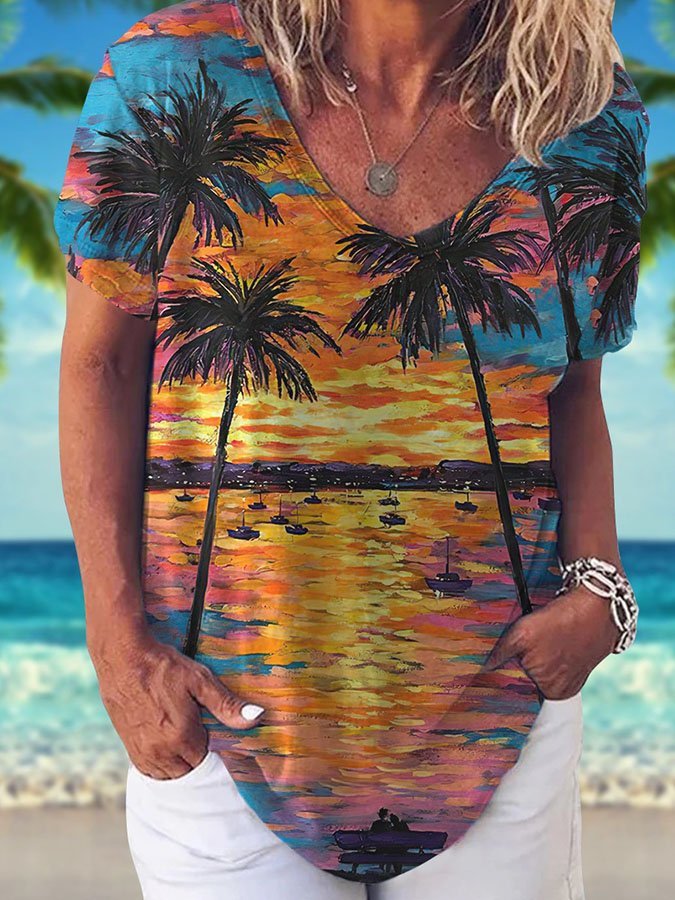 V-Neck Palm Tree Print Short Sleeve T-Shirt