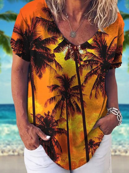 V-Neck Palm Tree Print Short Sleeve T-Shirt