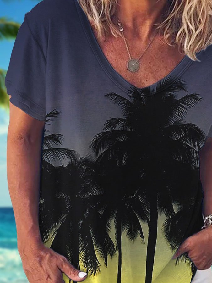 V-Neck Palm Tree Print Short Sleeve T-Shirt