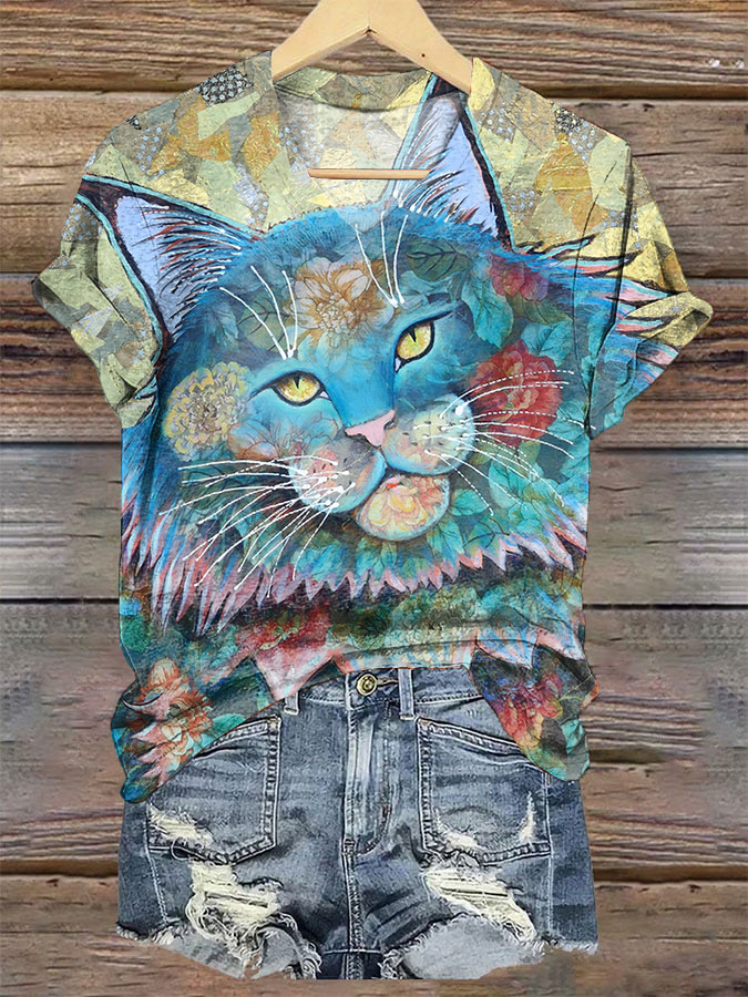 Vintage Cat Print V Neck Short Sleeve T-Shirt